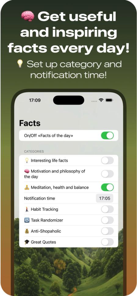 • Daily fact engine with rich theme selection: life hacks, wellness, philosophy, anti-consumerism, and more