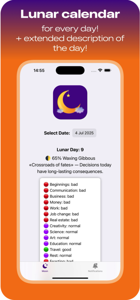 MoonCa Lite helps you better understand yourself and choose the right time for action, communication, creativity or rest. This is your daily navigator in the flow of lunar energy.